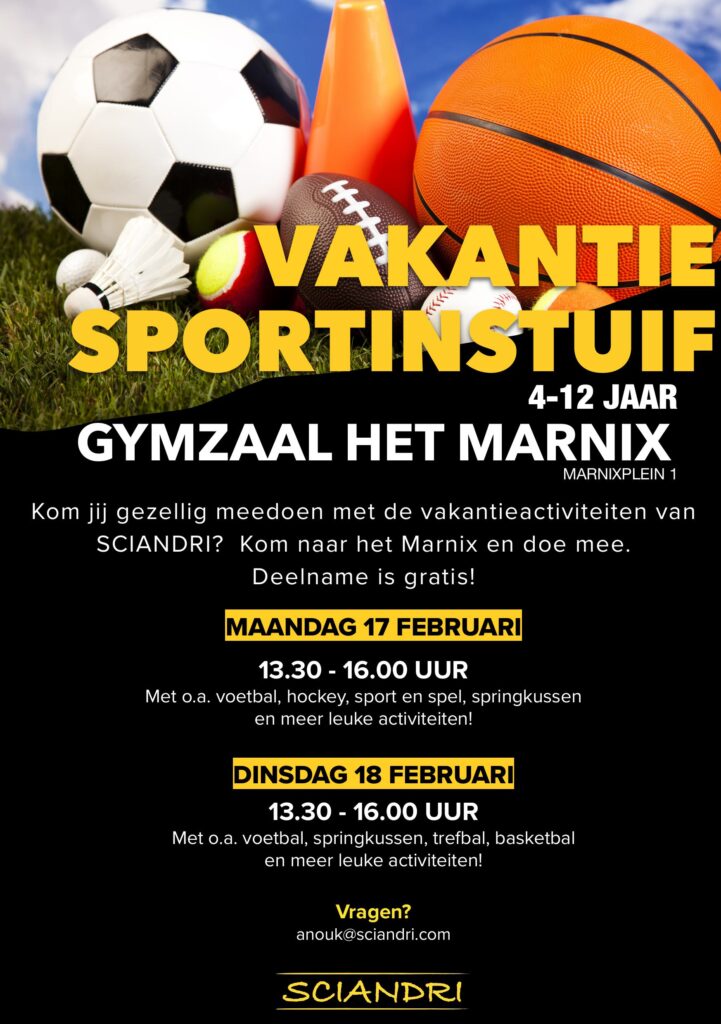 | Omschrijving | Kom in de voorjaarsvakantie naar de sportinstuif van SCIANDRI. Op 17 en 18 februari zijn er verschillende activiteiten in gymzaal Het Marnix waar de kinderen gratis aan mee kunnen doen. Springkussens, voetbal, hockey, sport en spel, trefbal, basketbal en nog veel meer leuks! De voorjaarsvakantie wordt een feestje! Vooraf aanmelden is niet nodig. Kom gezellig langs en neem je vriendjes en vriendinnetjes mee. Voor meer informatie: anouk@sciandri.com |