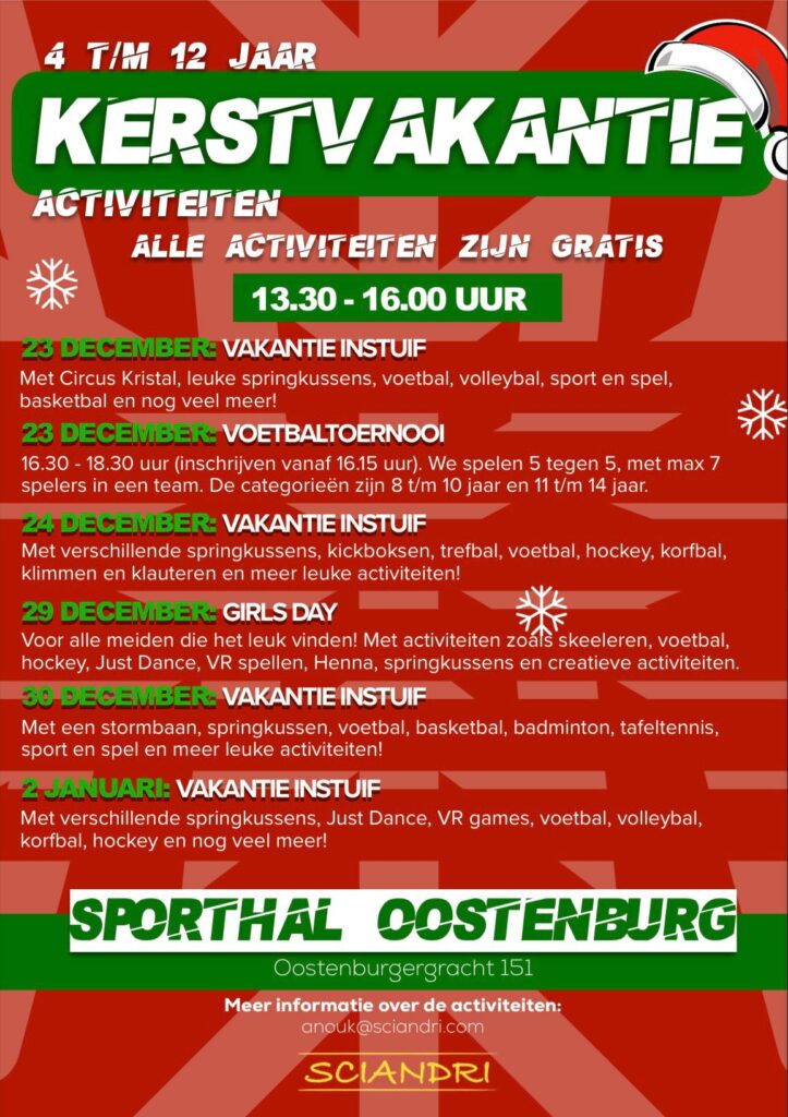 | Omschrijving | Tijdens de Kerstvakantie organiseert Sciandri diverse activiteiten in Sporthal Oostenburg. Kijk op de flyer wat er per dag te doen is. Kom je ook gezellig meedoen? |